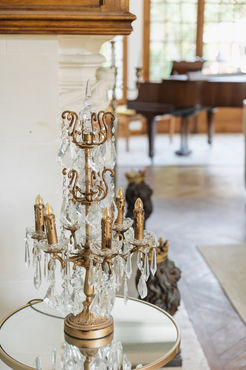 The grand entrance is a breathtaking introduction to the château, featuring a striking 10-foot crystal chandelier cascading from the second-floor balcony. This space is ideal for welcome drinks or can be transformed into an elegant setting for entertaining.